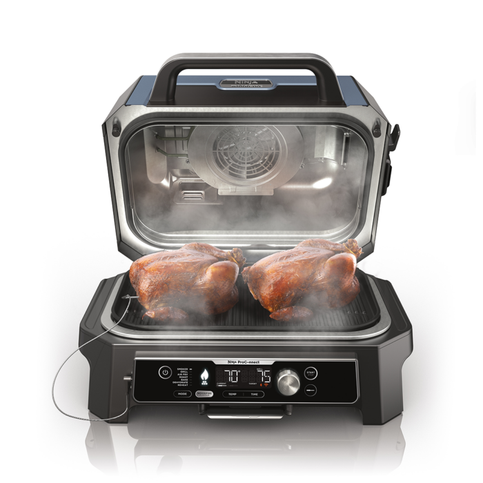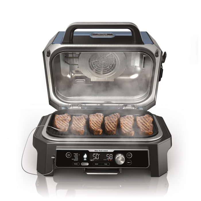 The Ninja Woodfire Pro Connect is a smart and versatile outdoor barbecue that. combines grilling, smoking and air fryer functions. The appliance runs on electricity and 100% natural Woodfire wood pellets, giving your food an authentic smoky BBQ flavour. Thanks to the Ninja Pro Connect app with Wi-Fi and Bluetooth connectivity, you can monitor and control your cooking directly from your phone.