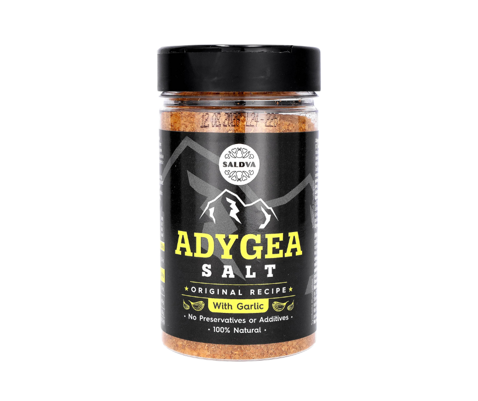 Saldva Adigee-suola valkosipulin kanssa on maukas ja aromaattinen suolaseos, jossa yhdistyvät perinteinen Adygee-suola ja tuore valkosipuli.